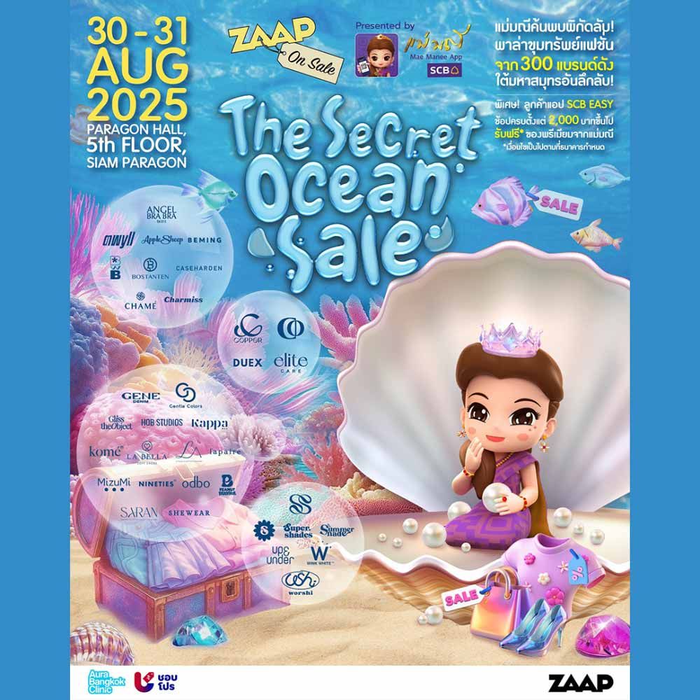 คลื่นดีลพิเศษสุดยิ่งใหญ่ กำลังมา เตรียมพบกับประสบการณ์ช้อปปิ้ง กว่า 300 แบรนด์ดัง ในงานZAAP ON SALE ครั้งที่ 40 Presented by แม่มณี “The Secret Ocean Sale” ช้อปครบ จบในงานเดียว กับที่สุดของงานแฟชั่นให้คุณได้สัมผัสสินค้าจริง และยังมีกิจกรรมให้ร่วมสนุกภายในงาน